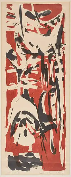 Cherry's earliest paintings were figurative and were seen to have been inspired by European traditions. One critic described Cherry's 1927 self portrait (shown in the infobox, above) as "decidedly French-inspired, a clumsy Cezanne card player with a strong hand cradling his pipe.[8] His paintings of the 1930s were figurative in the then-prevalent American Scene style. Before transitioning from figurative to abstract painting, he found his first commercial success in making objects that he called pictographs. These were mobiles and stabiles made from small found objects such as wire, rope, chains, and fragments of glass.[31][34] A critic who had followed Cherry's career closely, suggested that he gave up making these constructions and returned to painting largely because he felt they attracted the wrong kind of attention. He wanted to be taken seriously and not as a maker of witty and light-hearted conversation pieces.[8] During an oral history interview in 1965, Cherry spoke about his subsequent transition to abstraction. On moving to Manhattan in the late 1940s, he befriended Kline, de Kooning, and the other artists who were struggling to develop a new approach to painting. Regarding the importance of his participation in their explorations, he later said, "I think it's very rare that someone working alone comes up with something which is way in advance of his time... Generally it's a group action of some kind".[2] His lithograph called "Dogma" (Image No. 1), made in the late 1940s, is one of his first works in the new style he was then developing.