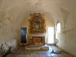 The original core of the hermitage is located in the lower part of the church, carved into the rock. It has two entrances, the first of which leads to what is called the room of the Crucifix, from where, via some steps, one reaches another room that might have been the resting place of Pietro da Morrone. The second entrance leads to two rooms for the burial of the Caracciolo princes of San Buono. Following are a first block of service rooms on the ground floor and chambers on the upper floor, while a second section consists of six large rooms in a state of ruin.