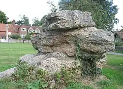 The silica is very hard, providing the stone with a variety of applications. Large pieces of puddingstone are found at the base of the walls of St Mary's Church, Chesham. It has also been used as an auxiliary building material supplementing flintstone buildings such as St Mary's Church, Stocking Pelham, St Lawrence's Church, Bovingdon, and the parish church at Sarratt; as a decorative feature or waymark in Hertfordshire villages, such as at Watton-at-Stone; or, during Roman times, for grinding corn. A fragment of a quern-stone made from puddingstone was found by archaeologist Dominic Shelley on the site of a Romano-British farmstead in Great Eversden, Cambridgeshire.[7] Some puddingstones are used as landmarks on greens and commons such as at The Lee, Ashley Green and Cholesbury near Chesham and at Sarratt, Herts.