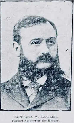 The pilot-boat Hesper, No. 5, was launched on October 4, 1884, from the Montgomery & Howard shipyard in North Chelsea, Massachusetts.[2] She was designed from a model by Dennison J. Lawlor.[3] The pilots assigned to the Hesper were: Captains George W. Lawler, James L. Smith, J. A. G. McField, Augustus Hooper, R. L. Stubbs, and R. Y. Woodbury.[4]