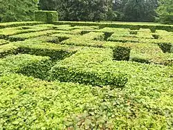 The gardens of the castle have a statue pond, a maze made out of beech trees, and an outdoor bowling alley. They can be visited in the months of April and May.[2]