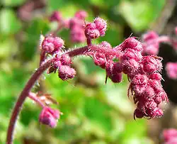 Heuchera elegans is a rhizomatous perennial herb with multi-lobed leaves. It produces an erect, drooping inflorescence which bears bright pink or magenta bell-shaped flowers.