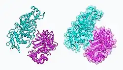 NAG-thiazoline, NGT, acts as mechanism based inhibitor of hexosaminidase A. In patients with Tay–Sachs disease (misfolded hexosaminidase A), NGT acts as a molecular chaperone by binding in the active site of hexosaminidase A which helps create a properly folded hexosaminidase A. The stable dimer conformation of hexosaminidase A has the ability to leave the endoplasmic reticulum and is directed to the lysosome where it can perform the degradation of GM2 gangliosides.[10] The two subunits of hexosaminidase A are shown below: