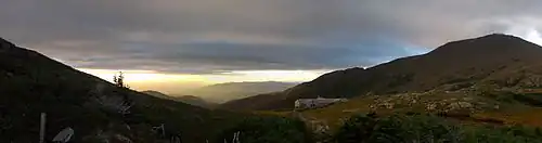Galehead Hut (44°11′16″N 71°34′08″W / 44.1879°N 71.5688°W) lies nearly 3,800 feet (1,200 m) above sea level on rugged Garfield Ridge. Construction on the original structure there began in 1931, using wood from the surrounding trees. It was completed in 1932, along with Zealand Falls Hut, its closest northern neighbor. A small space under the front porch was used to store perishable foods. In 1938, Galehead gained a temporary 360 degree view when the Great New England Hurricane blew over all the surrounding trees. It was replaced in June 2000 with a new Americans with Disabilities Act-compliant hut, complete with a wheelchair ramp even though it is 5 miles (8 km) of rough trail from the nearest trailhead.[8] Given its altitude and remoteness, the vast majority of the new structure's materials had to be carried in; thus mainly lightweight materials were utilized. New features include composting toilets (already in use at Mizpah Spring Hut, Carter Notch Hut, and Lonesome Lake Hut), both solar panels and a wind vane for producing power, and a foundation fastened to the granite bedrock with grouted rebar, giving the hut the ability to withstand winds up to 125 miles per hour (200 km/h). The hut is 0.9 miles (1.4 km) from the summit of South Twin Mountain and 0.5 miles (800 m) from the summit of Galehead Mountain.[9][10][11]