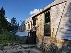 Carter Notch Hut (44°15′33″N 71°11′44″W / 44.2591°N 71.1955°W) is the easternmost hut in the system[21] and is open year-round. Between 1996 and 2006, it operated on a self-service basis; since then it has resumed operating as a full-service hut during the summer season, remaining self-service the rest of the year.[22][23] The site's use as a shelter began in 1904 as a simple log cabin; the building was rebuilt as a hut in 1914, making Carter Notch the oldest building in the hut chain, supposedly by Milton McGregor, aka "Red Mac".[24] There are two bunkhouses located a short distance from the main hut structure; thus from the cliffs above, the hut is viewed as a small compound. There are two small ponds located nearby, as well as a tremendous boulder field. Carter Notch helped establish the hut as a viable pursuit for the AMC, and after its initial success, the group began to lay plans for a hut system.[10][25]