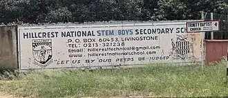 Hillcrest National STEM Secondary School (formerly known as Hillcrest National Technical Secondary School) is a Government High School running from Grade Eight (8) to Grade Twelve (12).[1] The school is located in Livingstone, Zambia, and was established in 1956.[2][3] It is one of the biggest schools in the country selecting students from all provinces in Zambia. The school offers both O Level and A Level education and is a boys school, formerly co-education but reverted to single sex in 2021.