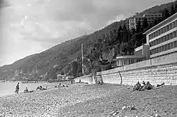 During the Stalin years, a purge was carried out against Communist Party officials and intelligentsia of Abkhaz provenance on the orders of Lavrentiy Beria, then-the Party Secretary in Transcaucasus and himself a native of Abkhazia, in order to break a resistance to forced collectivization of land. The Abkhaz party leader Lakoba suddenly died shortly after his visit to Beria in Tbilisi in December 1936. There was a strong suspicion that he was poisoned by Beria who declared Lakoba an "enemy of the people" posthumously. The purges in Abkhazia were accompanied by the suppression of Abkhaz ethnic culture: the Latin-based Abkhaz alphabet was changed into Georgian and all the native language schools were closed, ethnic Georgians were guaranteed key official positions, many place names were changed to Georgian ones.[37][38] In the terror of 1937-38, the ruling elite was purged of Abkhaz and by 1952 over 80% of the 228 top party and government officials and enterprise managers were ethnic Georgians; there remained 34 Abkhaz, 7 Russians and 3 Armenians in these positions.[39] Between 1937 and 1953 tens of thousands of peasants from Western Georgia were settled in Abkhazia. In the 1926 Soviet census, the Abkhaz accounted for 26.4% of the region's population. The demographic engineering of the late Stalin period brought this proportion down to 17—18%. Abkhazia is mountainous and has a shortage of arable land, which made it difficult to send in new settlers. This was one of the reasons why in 1949 the Greek and Turkish minorities were deported from Abkhazia to Kazakhstan and other Central Asian republics, and Georgians were settled in the formerly Greek and Turkish villages.[39][40] Abkhazia experienced collectivisation in 1936–1938, much later than most of USSR.[41]