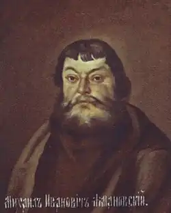 During the Time of Troubles, in 1608–1609, Ivanovo was attacked by Polish–Lithuanian forces and their allies from the Tushino camp, including Cossacks. The village served as a base camp for the companies of Pan Martin Sobelsky and Chizhevsky (or Zhichevsky), from which the invaders launched raids on neighboring lands.[17][13][18] Another historical mention of Ivanovo from this period appears in a letter dated February 20 (March 2 in the new style) 1609, from the traitorous Suzdal voivode F. K. Pleshcheyev to the Lithuanian hetman Jan Sapieha, which uses the modern form of the village's name:[18][19]