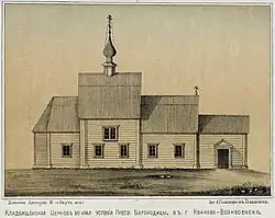 Ivanovo emerged near the old road from Rostov to Gorodec, by the stream Kokúy — a right tributary of the Uvod; it was likely originally called Potekusha or Potok.[5] The historical core and long-standing public center of Ivanovo is the modern Revolution Square,[6][5] where the wooden Exaltation of the Cross Church stood — possibly the oldest religious structure in this village. The streets Stanko, Palekhskaya, Stepanova,[7] 10 August, and Krasnogvardeyskaya[8] (modern names) are considered by various researchers to be the oldest streets of Ivanovo.