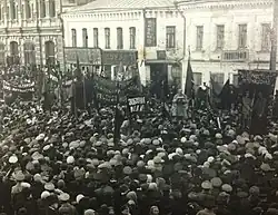 The workers of Ivanovo-Voznesensk actively participated in the Russian Revolution of 1905. On May 25, 1905, a general strike began in the city, involving about 30,000 workers from nearly all local enterprises. The strikers presented around 30 demands to factory owners, primarily economic in nature (such as a guaranteed minimum wage increase, an 8-hour workday, benefits, and improved sanitary and technical working conditions), but also included political demands, insisted upon by the RSDLP, such as the convocation of a Constituent Assembly, the introduction of democratic freedoms, and the celebration of May Day.[114][115]
