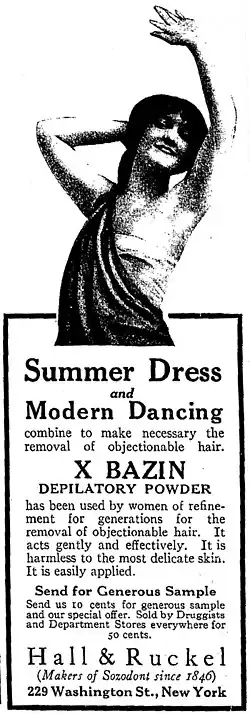 Advertisements suggesting that women remove hair under the arm, and explaining how and why to do so, were published as early as 1908,[1] and ran more steadily beginning in 1914.[8] The 1915 advertisement on the right ran in Harper's Bazaar for a depilatory powder called X Bazin is typical of ads during this time in that it defines why underarm hair removal is necessary. It also shows an image of a woman in a sleeveless gown with her arm up and the caption "Summer Dress and Modern Dancing combine to make necessary the removal of objectionable hair."[1]