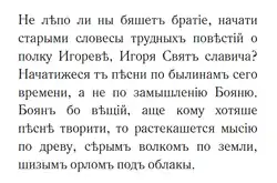 - Не лѣпо ли ны бяшетъ братіе, начати старыми словесы трудныхъ повѣстій о полку Игоревѣ, Игоря Святъ славича? Начатижеся тъ пѣсни по былинамъ сего времени, а не по замышленію Бояню. Боянъ бо вѣщій, аще кому хотяше пѣснѣ творити, то растекашется мысію по древу, сѣрымъ волкомъ по земли, шизымъ орломъ подъ облакы.