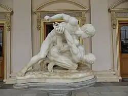 Greek wrestling was a popular form of martial art in which points were awarded for touching a competitor's back to the ground, forcing a competitor out of bounds (arena).[16] Three falls determined the winner. It was at least featured as a sport since the eighteenth Olympiad in 704 BC. Wrestling is described in the earliest celebrated works of Greek literature, the Iliad and the Odyssey.[17] Wrestlers were also depicted in action on many vases, sculptures, and coins, as well as in other literature. Other cultures featured wrestling at royal or religious celebrations, but the ancient Greeks structured their style of wrestling as part of a tournament where a single winner emerged from a pool of competitors.[14] Late Greek tradition also stated that Plato was known for wrestling in the Isthmian games.[18]