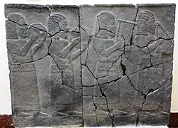 A Late Hittite relief from Carchemesh (9th century BC) shows a drum with a diameter of about a meter, carried and played by two men with shoulder-straps, while a third man whose role is not clear stands behind the drum. Reliefs from Zincirli (8th century BC) show men holding frame drums in their left hands and beating them with their right hands.[18]