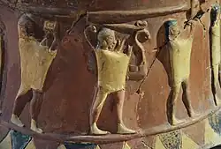 The little archaeological evidence that there is consists largely of depictions on ritual vessels and on stone reliefs. Musical instruments or their components are rarely recovered, in comparison with the situation in Mesopotamia and Egypt. Some relatively well-preserved noise-makers, such as rattles, clash cymbals[2] and sistrums have been recovered from pre-Hittite times. Cult vases from the early Hittite period, such as the İnandık vase, the Bitik vase, and the Hüseyindede vases have depictions of people playing music, often accompanied by acrobats and sacrifices.