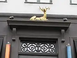 The building is three storeys tall and five bays wide. Over the main entrance is a gilded sculpture of a lying deer, a reference to the name of the pharmacy ("Deer Pharmacy"").