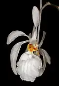 The flowers are white and wide open. The lip is three-lobed. The lateral lobes are erect and dotted adaxially. The central part is spread out over a large area and is parallel to the gynostemium. The lip is shaped to allow potential pollinators to depress the middle lip. The flowers have an elongated spur, which is strongly reduced in the subgenus Brachycentron. The gynostemium has a large scar area. The stamen contains two separate pollina. The stipes connecting the pollina and the adhesive disc (Viscidium) bend in the middle when removed from the rostellum. The rostellum is deeply incised.[4] The number of chromosomes is 2n = 38 in almost all species. Holcoglossum tsii has 76 chromosomes in the diploid chromosome set (2n = 76).[5]