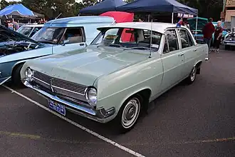 The Holden HD sedans and station wagons were released on 15 February 1965 with coupe utility and panel van body styles following in July of that year.[1] The HD range replaced the Holden EH series which had been in production since 1963.[1] The HD had a completely new body, which was wider and longer than that of the EH and offered significant increases in passenger space, load space and equipment levels.[2] Body styling exhibited strong similarities to Vauxhall's FC Victor of the previous year, including that car's unusual concave rear window. Disc brakes were offered for the first time on a Holden model and were available from the 1st June 1965.[3] The optional Hydramatic automatic transmission as used in the EH was now replaced by a Powerglide two– speed unit.[2] The HD was also the first Holden to be offered with a factory performance engine option, the "X2" which included twin downdraft Stromberg carburetors and exhaust headers.[3] The HD is often confused with the later HR but can be recognised by the front indicators being mounted under the bumper (the HR had round indicators mounted in the grille) and the wrap around tail lights at the back (the HR had narrow lights that extended up the end of the rear fins but not around the edge)