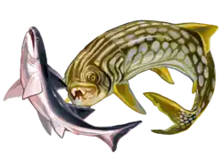 | Artist's reconstruction of Holdenius holdeni and its prey, an unidentified Ctenacanth chondrichthyan | |
