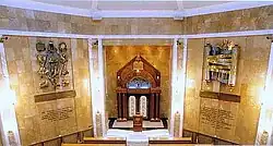 The interior of the building was designed by Frank Meisler. Meisler created wall sculptures showing Jerusalem, the Twelve Tribes of Israel and the Five Books of Moses.