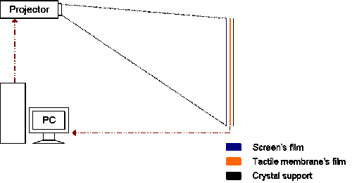 The computer sends the image to the projector. The projector generates light beams which form the image on the screen. When the user touches the screen, a tactile membrane film reacts to these movements, generating electrical impulses that are sent back to the computer. The computer interprets the received impulses and modifies the projected image according to the information.