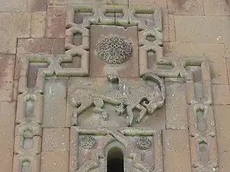 Exceptionally rich decorations cover a large portion of the church. There are beautiful motifs on each side at the second floor level and geometric patterns around the cornices, eaves, and other parts of the walls. Notable is the large cross carved in high relief on the front flanked by the Virgin Mary holding the baby Jesus and another saint. Below and just above the portal to the second floor are the motifs of a bull and lion. Above the larger window on the right façade is a motif of a large bird with a geometric rosette on its chest holding a hooved animal in its talons. On the left façade is a mountain goat, and on the rear is a large cat pouncing upon a goat.