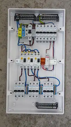Home wiring is electrical wiring for houses. It includes wiring for lighting and power distribution, permanently installed and portable appliances, telephone systems, heating or ventilation system control, and increasingly for home theatre and computer networks.[1]