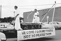 At the high school level, students generally compete by grade level in events such as spirit days, parade floats, and powder puff football. Modoc High School 2024 organized events such as a powder puff football competition, a cheerleading competition and a themed dress-up day that reflected competition and school spirit among all grade levels.[21] The competition at the collegiate level is mainly between Greek-letter organizations and, to a lesser degree, residence halls. At most larger schools, fraternities and sororities compete on parade floats, house decorations, skits, talent competitions, and service events such as blood drives or food drives. At Iowa State University, the fraternity has organized lawn displays, campus-wide spiritual gatherings, skits Like "Yell Like Hell" and community service challenges. This homecoming celebration brings everyone together, promotes interaction among students, and enhances competition within the organization and between classes.[22] On coronation night, some schools play games between classes. Such events include the pyramid, three-legged race, pop chug, and tug of war.