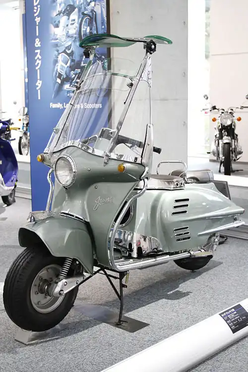 The Juno K was a deliberately elaborate bike in 1954. It was Honda's first scooter and would be competing with the well established Fuji Rabbit and Mitsubishi Silver Pigeon. It featured the first electric start, a full windscreen with a tilt-back sun-shade, and built-in signal lamps. It also introduced Fibre-Reinforced Plastic body construction to Japan.[1]