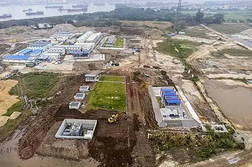 Although the route of Line 7 to Huangpu in the early planning stage will pass through Hongshengsha Island, it did not set up a station on the island until 2016. Eventually, the station was included in the second phase of Line 7 for construction.[3] At the same time, in order to cooperate with the setting of the station, Guangzhou Port Co. Ltd., the owner of the original site of the station, handed over the island to the Huangpu District Land Development Center for collection and preservation.[4] Construction started on 18 April 2019,[5] the construction of the main envelope structure was completed in April 2020.[6] In May 2021, the main structure of the station was successfully topped out, making it the first station to do so on the second phase of Line 7.[7]