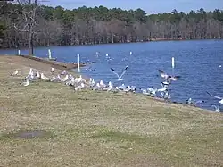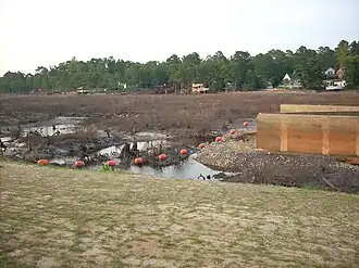 Hope Mills Lake, also referred to as Hope Mills Lake #1, and by long-time citizens as The Pond, was a lake in Hope Mills in Cumberland County, North Carolina. Before it was a lake, it was a mill pond which was fed by Little Rockfish Creek. The mill pond was created in 1839 near the Hope Mills Dam for the first cotton mill in the area. At the time, the area was called Little Rockfish Village. In 2003, heavy rains caused the earthen dam to fail and the lake was unintentionally drained. By 2006, the lake had not been restored so the Friends of Hope Mills Lake was incorporated as a North Carolina non-profit organization to promote and raise funds for the timely restoration and preservation of the dam.[1] In 2008 the new dam was completed and full for the first time in 5 years. In June 2010, the Lake was intentionally drained for safety reasons, after an inspection discovered a sinkhole that was leaking water under the dam's structure.[2]