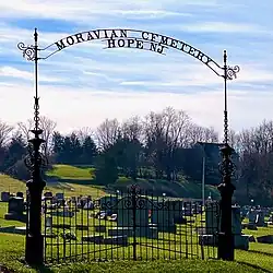 After a formal survey of the village completed on November 26, 1774, the community was officially accepted by The Moravian Church and the name was changed by drawing lots on February 8, 1775, from Greenland to Hope.[20][21] The name derives from the "hope of immortality" of the early Moravian settlers.[22]