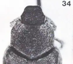| Black and white photo of the head and prothorax of a Hoplia callipyge specimen | |