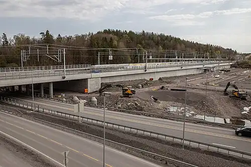 ![]() Horten station under construction, May 2024. The station and tracks are on an elevated bridge that passes over the nearby road. Station entrance from parking lot can be seen on the right. by Øyvind Berg | |||||