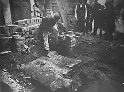 Large numbers of human bones were found during the development of the priory's land for housing in the eighteenth and nineteenth centuries, including some found to the south of Bull Street which may suggest either that a second graveyard existed south of Bull Street, or that the original line of Bull Street may itself have lain further to the south.[7] This has been taken by some historians to indicate that the chapel may have been the original church of Birmingham and preceded the establishment of St Martin in the Bull Ring,[7] though other historians doubt this.[8]