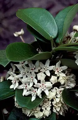 Hoya australis, commonly known as waxflower or common hoya,[2] is a species of flowering plant in the Apocynaceae or dogbane family and is native to northern and eastern Australia, Papuasia and Melanesia. It is a succulent vine or subshrub with fleshy or leathery, elliptic, oblong, egg-shaped or more or less round leaves, racemes of fleshy, cream-coloured and red flowers, and spindle-shaped follicles. It is a popular garden plant, noted for its fragrant flowers.
