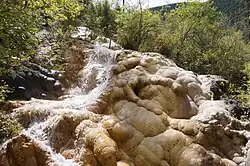 Huanglong (simplified Chinese: 黄龙; traditional Chinese: 黃龍; pinyin: Huánglóng; lit. 'yellow dragon') is a scenic and historic interest area in the northwest part of Sichuan, China. It is located in the southern part of the Minshan mountain range, 370 kilometres (230 mi) north-northwest of the capital Chengdu.[1] This area is known for its colorful travertine pools formed by calcite deposits, especially in Huanglonggou (Yellow Dragon Gully), as well as diverse forest ecosystems, snow-capped peaks, waterfalls and hot springs. Huanglong is also home to many endangered species including the giant panda and the Sichuan golden snub-nosed monkey.[1] In addition, a large population of the endemic orchid species 'Cypripedium plectrochilum' was discovered at the site.[2] Huanglong was declared a World Heritage Site by UNESCO in 1992 because of its outstanding travertine formations, waterfalls and limestone formations as well as its travertine terraces and lakes rating among the three most outstanding examples in the world.[1][3]