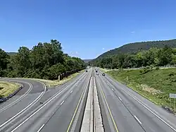 US 322 crosses into Mifflin County and becomes an unnamed road, coming to an eastbound truck brake check station. At this point, the route begins to descend the Seven Mountains, passing between Rothrock State Forest to the west and Bald Eagle State Forest to the east. The road turns south and then southwest before it reaches an eastbound runaway truck ramp and makes a curve to the southeast, passing west of the Laurel Creek Reservoir. US 322 turns northeast and leaves the state forest, curving east and becoming a freeway. The route turns south through forests and enters the agricultural Kishacoquillas Valley, where it comes to a trumpet interchange connecting to Old US Hwy 322 that provides access to the community of Milroy. The freeway continues south and reaches a diamond interchange with PA 655 that serves the community of Reedsville. Past this interchange, US 322 runs southeast and crosses the Kishacoquillas Creek, heading through a gap in Jacks Mountain along with the creek. The route curves south and comes to an interchange with Ferguson Valley Road that provides access to the community of Yeagertown and the borough of Burnham. The freeway runs through rural areas before passing near development and reaching a directional T interchange with the US 22/US 522 freeway. At this point, US 22/US 522 become concurrent with US 322 and the freeway has an interchange with Electric Avenue. From here, the freeway enters the borough of Lewistown and runs to the west of the Kishacoquillas Creek. US 522 splits from US 22/US 322 at an interchange by heading northeast on East Walnut Street. At the US 522 interchange, the freeway passes over a Juniata Valley Railroad line. Past this interchange, US 22/US 322 curves south along the eastern border of Lewistown and crosses a Juniata Valley Railroad line at-grade before reaching an eastbound exit and westbound entrance with East Charles Street. The freeway crosses the Kishacoquillas Creek and leaves Lewistown upon crossing Jacks Creek and heading into rural areas. The two routes curve east and come to a westbound exit and eastbound entrance with the eastern terminus of US 22 Bus., at which point the freeway begins to parallel the Juniata River located south of the road. US 22/US 322 curves to the northeast and runs between Shade Mountain to the north and the river to the south as it heads through the Lewistown Narrows water gap.[3][4] This section of road includes the longest mechanically stabilized earth wall in the U.S.[5]