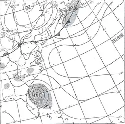 As the hurricane approached the southeastern United States, the U.S. Weather Bureau issued storm warnings from Vero Beach, Florida to Wilmington, North Carolina.[3] Later, the agency issued a hurricane warning from Fernandina, Florida to Georgetown, South Carolina, prompting the threatened areas to enact storm preparations and for ships to return to harbor.[4] Near Jacksonville, Florida, the United States Navy sent 17 planes to the Naval Air Station Olathe in Olathe, Kansas.[5]