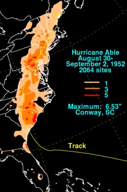 Hurricane Able was the only hurricane to make landfall in the United States in the 1952 season.[1] Forming on August 18 off the west coast of Africa, Able moved generally west- to west-northwestward for much of its duration. It was first observed by the Hurricane Hunters on August 25 to the north of the Lesser Antilles. Two days later, Able attained hurricane status, and on August 30 it turned sharply to the north-northwest in response to a cold front. The hurricane reached peak winds of 100 mph (160 km/h) just prior to moving ashore near Beaufort, South Carolina on August 31. Although it quickly weakened below hurricane force, Able maintained tropical storm force for almost two days over land, eventually dissipating over Maine on September 2.