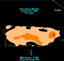 The maximum rainfall reported in association with Bertha was 8.17 in (208 mm) along the Rio Icacos in Naguabo. Wind reports from the Roosevelt Roads Naval Base on July 8 indicated a maximum sustained wind speed of 44 mph (71 km/h). Although heavy rain did occur, there was no widespread or significant inland flooding reported. There were, however, several reports of swollen rivers which caused some minor flooding of low lying and urban areas; coastal flooding was reported from Carolina to Loiza along road 187. In addition, recorded rainfall at the Luis Muñoz Marín International Airport was 1.56 in (40 mm).[2]