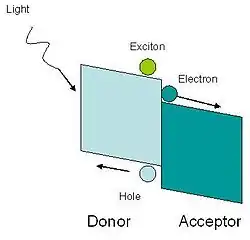 Hybrid solar cells mix an organic material with a high electron transport material to form the photoactive layer.[2] The two materials are assembled in a heterojunction-type photoactive layer, which can have greater power conversion efficiency than a single material.[3] One of the materials acts as the photon absorber and exciton donor. The other facilitates exciton dissociation at the junction. Charge is transferred and then separated after an exciton created in the donor is delocalized on a donor-acceptor complex.[4][5]