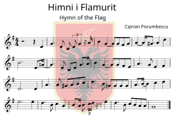 "Himni i Flamurit" ('Hymn to the Flag') is the national anthem of Albania, adopted in 1912. Its music is derived from the Romanian patriotic song "Pe-al nostru steag e scris Unire", composed by Ciprian Porumbescu.[1] The lyrics were written by Albanian poet Asdreni. The anthem was originally titled "Betimi mbi Flamur" ("The Pledge on the Flag").[2]