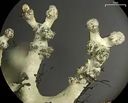 The upper surface is pale ivory or greenish-gray in color and develops specialized powdery structures called soredia that emerge through the surface, particularly at or near the lobe tips.[5] Along the margins of the lobes are small root-like attachments called rhizines, which extend up to 1 mm in length (occasionally 2 mm) and can be simple or sparingly branched.[5]