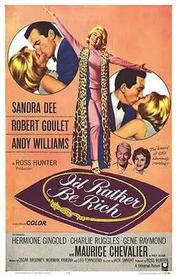 I'd Rather Be Rich is a 1964 American romantic comedy film with musical aspects directed by Jack Smight, produced by Ross Hunter and starring Sandra Dee.[1] The film focuses on a dying man who wishes to meet his granddaughter's fiancé, but he is unavailable, so the woman persuades another man to substitute for him. Then the grandfather recovers.[2][3]