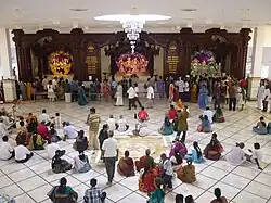 The prana pratishtha (deity installation) ceremony, when the deities of Lord Krishna and Radha and their sakhis—Lalitha and Vishaka—were installed in one of the three teak-wood altars in the main hall, and Kumbhabhishekam were performed on 26 April 2012. After the Kumbhabishekam and Maha mangala arati—the first decorated darshan of the deities—flowers were showered from a helicopter over the gopurams built in the Kalinga style with a Sudarshana Chakra on the top of the tallest tower. The deities in the temple on Burkit Road, T. Nagar unit have also been shifted to this temple.[5]
