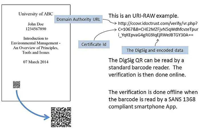The following education certificate examples use the URI-RAW DigSig envelope format. The URI format allows a generic barcode reader to read the DigSig where after it can be verified online using the URI of the trusted issuer of the DigSig. Often the ISO/IEC 20248 compliant smartphone application (App) will be available on this website for down load, where after the DigSig can be verified offline. Note, a compliant App must be able to verify DigSigs from any trusted DigSig issuer.