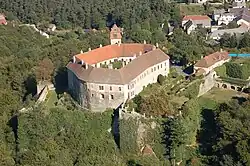 Iban Graf von Bernstein financially supported the dukes of Habsburg for decades. The first documented loans occurred in 1340 and 1343 to Albert II, in exchange for the revenues of the tribunal at Neunkirchen. Interestingly, Iban retired from courtly service for the remaining part of the reign of Albert, who died in 1358.[18] He was succeeded by his son, Rudolf IV, who invited Iban to the ducal council. Among other lords, Iban acted as a councillor in the lawsuit between Vienna and Wiener Neustadt over wine delivery and sale in November 1358. He appeared as a witness, when Rudolf granted the status of oppidum to Hollenburg in 1359. He also functioned in this capacity, when the duke established the St. George chapel in Enns in late 1361, after his victory over Lodovico della Torre, Patriarch of Aquileia. Iban participated in the war against Bavaria for Tyrol in 1364.[19] Iban and his son Heinrich were also present at the foundation of the University of Vienna on 12 March 1365.[20] Rudolf IV, who died in Italy, where prepared a second war against patriarch Lodovico, was jointly succeeded by Albert III and Leopold III. They inherited empty treasury and a lot of debt from their brother. Iban, who bought a house in Vienna, borrowed large sums to the dukes in the following years. He countersigned that document, which granted Leopold control over Tyrol, Further Austria and Carniola while income would be split between the dukes in July 1373. After the Treaty of Neuberg (1379), which determined the division of the Habsburg hereditary lands, Iban's lands in Styria belonged to Leopold's realm, while his possessions in Lower Austria was under the suzerainty of Albert.[20] In the 1370s, Iban received several pledge lands from the dukes (for instance, Mahrenberg and Aspang castles). He was last mentioned in this capacity in July 1382, when Albert III pledged the fort of Gutenstein to Iban.[16] In order to finance his dukes, Iban also had to apply for loans; at the end of his life he was owed to three Jewish traders in Neunkirchen.[13]