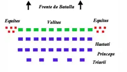 During the night, Cato took the most advantageous position,[81] keeping a legion in reserve, and placing the cavalry (equites) at the ends of the line and the infantry in the center;[82] typical disposition of a "maniple army" of the Republican era. The manipuli were organized in three distinct battle lines (in Latin, triplex acies) each based on a type of heavy infantry: hastati, princeps and triarii:[83] the hastati, infantrymen covered with leather armor, breastplates and helmets, formed in the front line of battle. They carried a wooden shield, reinforced with iron, a sword called gladius and two throwing spears known as pila (a heavy pilum and a smaller javelin).[84] The princeps, heavy infantrymen, usually formed the second line of soldiers. They were armed and protected in the same way as the hastati, but wore lighter chain mail instead of solid armour.[84] In the third line were the triarii. Their weapons and armor were similar to those of the princeps, with the exception that their main weapon was a pike instead of the two pila.[84] The equites, finally, were placed on both flanks of the battle formation.