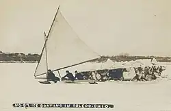 In the mid-19th century, two "ice yachting" clubs had formed, the Poughkeepsie Ice Yacht Club (1865) and the Hudson River Ice Yacht Club (1870), where wealthy boat owners sailed large iceboats with up to seven crew members. Boats were as long as 69 feet (21 m) and sailed as fast as 107 miles per hour (172 km/h), a record exceeding any other conveyance in 1885, set by the Icicle.[1] The first American Challenge Pennant occurred in 1881 on the Hudson river with five ice-yacht clubs competing. Races were sailed five times around a triangular course with one-mile legs, two of which were to windward. Iceboats were divided into four classes with sail areas ranging from less than 300 square feet to over 600 square feet.[4]